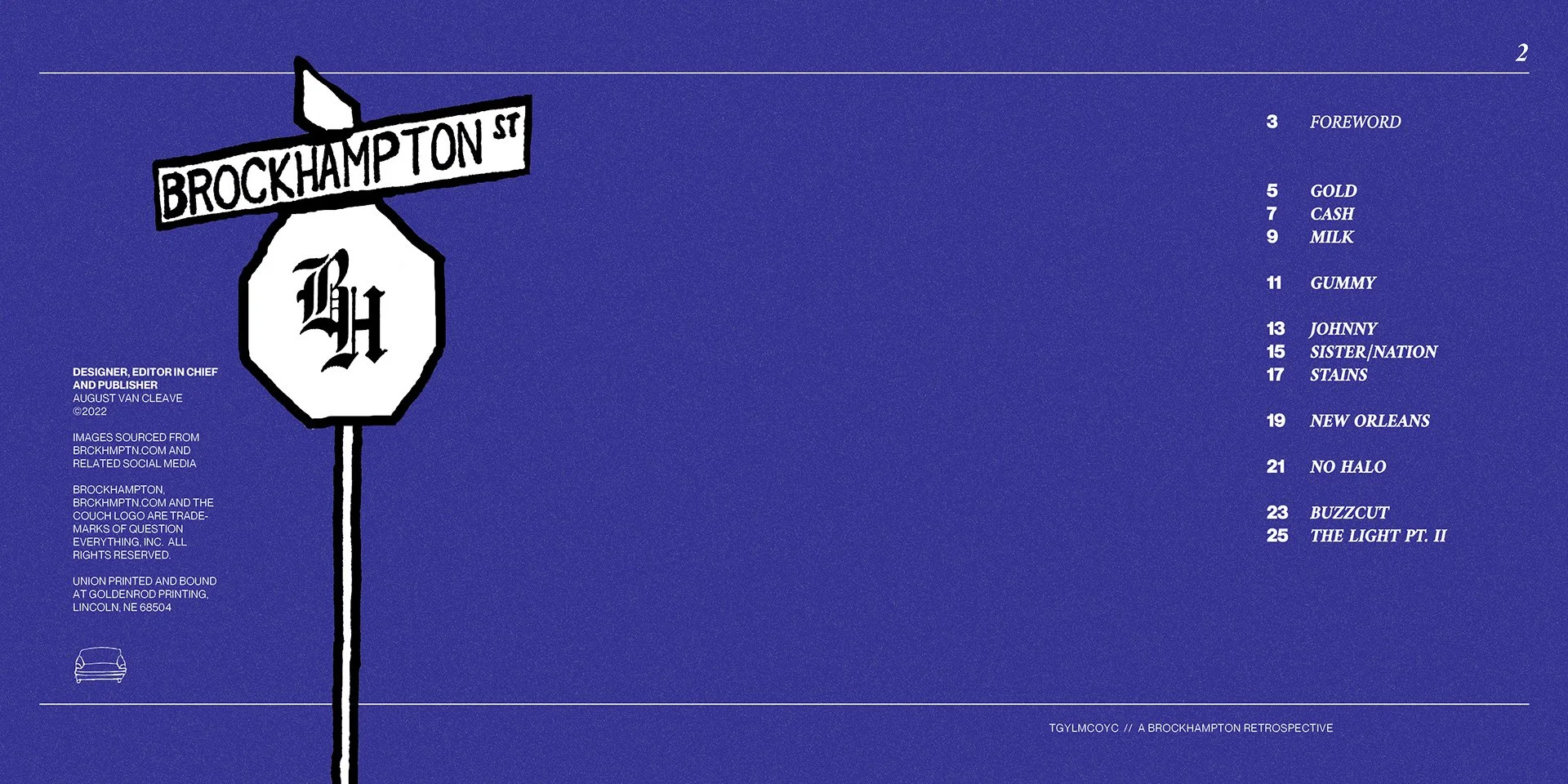 This retrospective zine was created to capture the complexity, energy, and sheer drive of BROCKHAMPTON at their finest. TGYLMCOYC includes twelve illustrated spreads with excerpts from the group’s spiritual highlights.