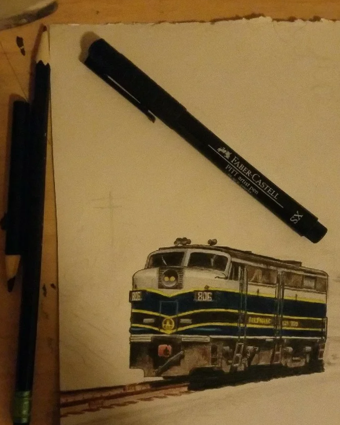 When drawing trains, I usually begin by interpolating scenes from multiple reference images into small pencil sketches. From there, I choose one scene for a full-size draft, and work color into the most detailed subjects.